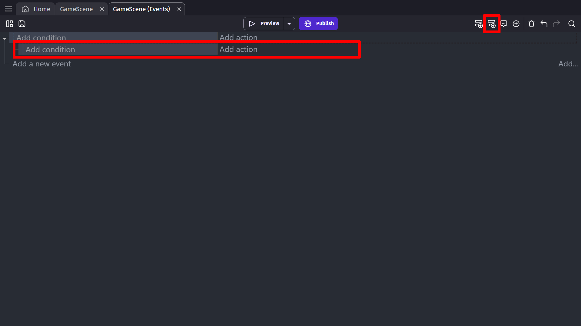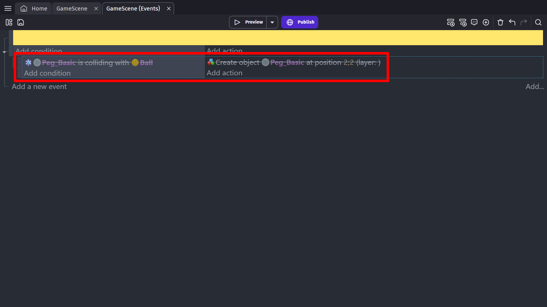 You can add any number of event blocks to the Event editor. Each event can have various conditions and actions. Once you add an event, you can use the conditions and actions to create the game's logic. Read more about conditions and actions.