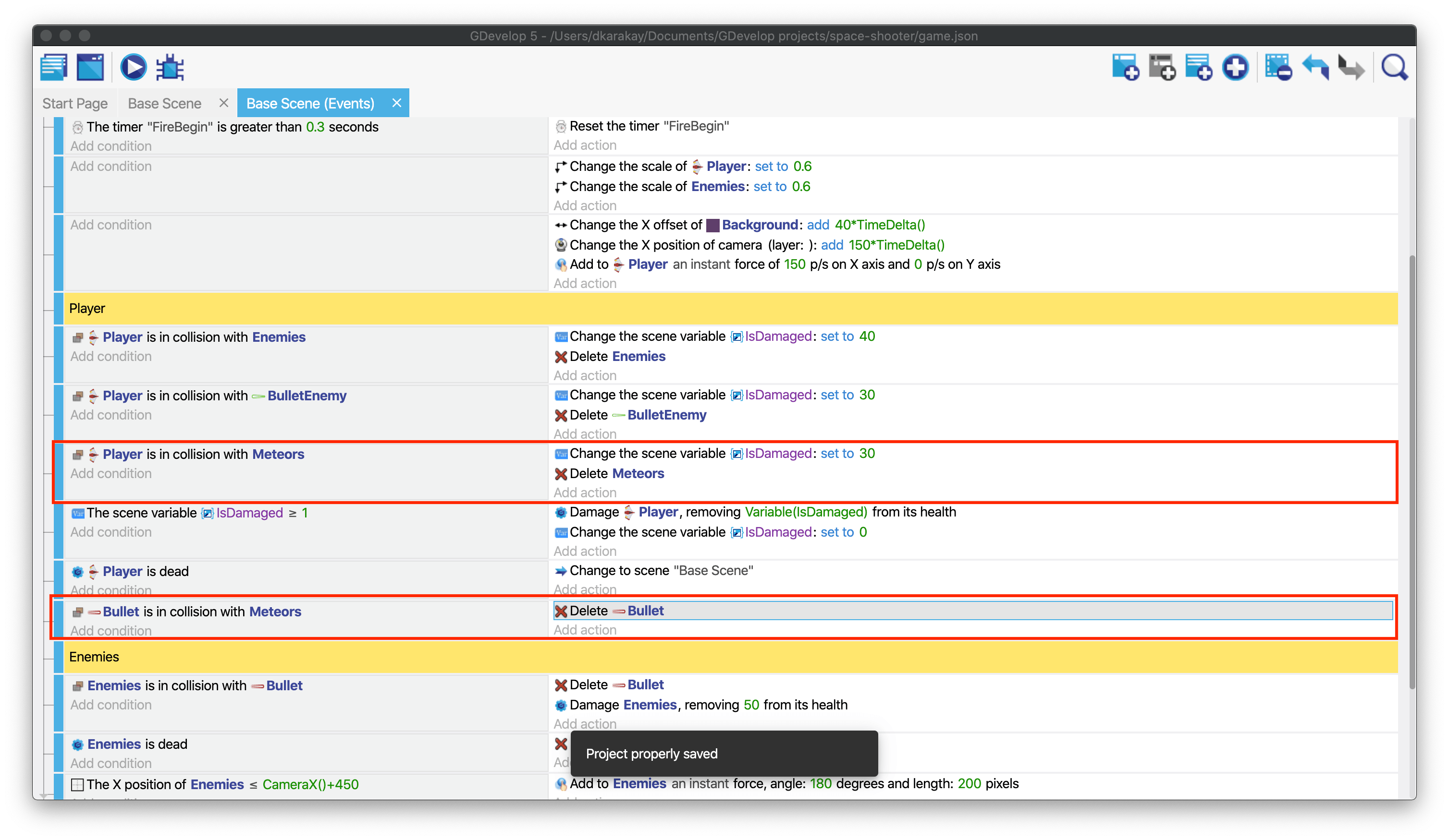 Open the Events tab and copy the condition and the action (Player collision with BulletEnemy), then paste it. Replace BulletEnemy in the condition and the Delete action with Meteors and ensure that IsDamaged is equal to 30.